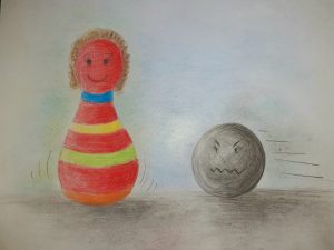 La storia da quella volta si ripetè ogni giorno, Katrina si ripresentava sempre più scura e veloce e si allenava notte e giorno pur di riuscire a sbarazzarsi di quel birillo così fastidioso, così allegro, così colorato… Il birillo Rina dal canto suo non aveva perso la sua vivacità e quando arrivava Katrina a volte barcollava, a volte tremava altre volte cadeva ma tutte le volte riusciva sempre a rialzarsi. Dopo un po’ gli altri, preoccupati per quell’ accanimento e dell’invidia di Katrina, provarono a mettere degli ostacoli davanti alla sua corsa ma ahimè ottennero solo di farla rallentare un po’. All’ inizio le corse di quella pallina vennero conteggiate ma poi arrivate a centinaia a migliaia nel corso del tempo si perse il conto ed ormai era diventato un appuntamento quotidiano e costante e, come avviene a volte per quelle battaglie lunghe lunghe di cui alla fine ci si abitua, diventò quasi “normale” e non se ne parlò più.